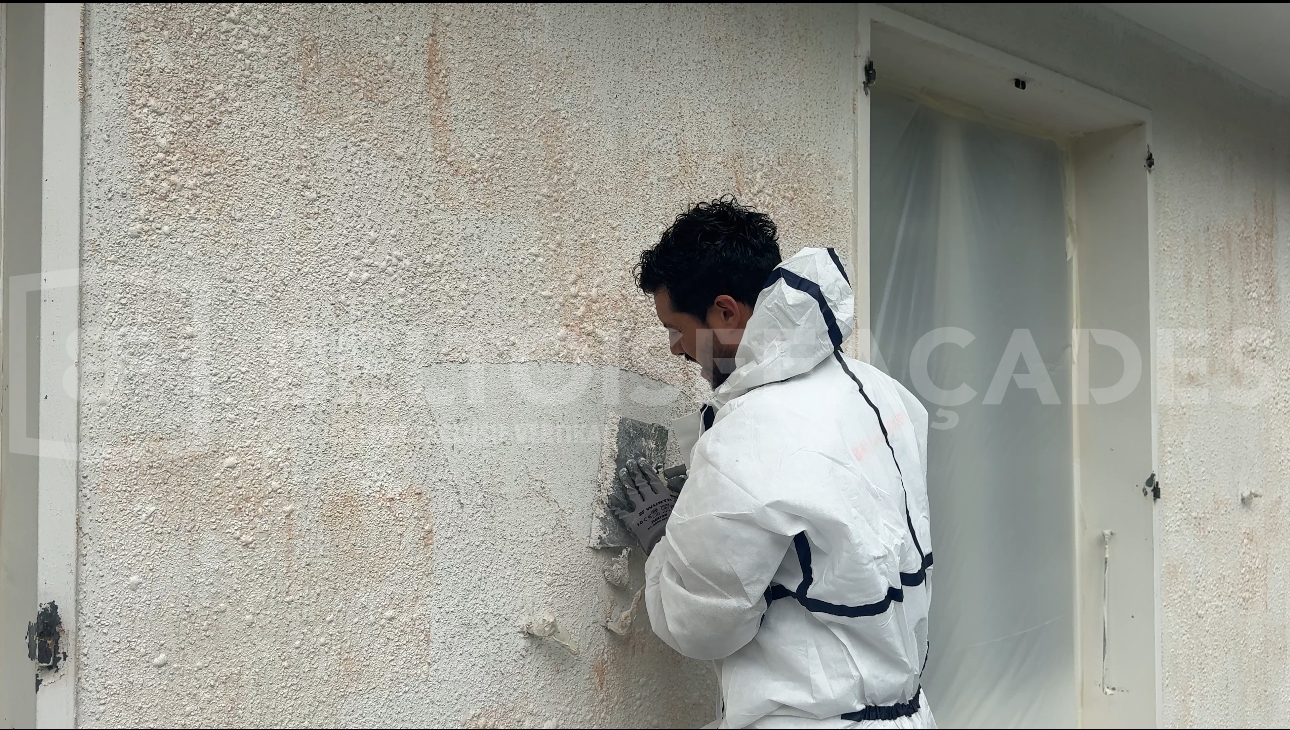 Afin de répondre à cette demande, il fallait décaper toutes les façades de l’ancien revêtement pour retirer les différentes couches de peinture ainsi que les grains. Nous avons donc appliqué un décapant chimique, le VERTIKAL DECAP+, que nous avons laissé agir quelques minutes avant de gratter le revêtement à la spatule pour tout retirer des façades.