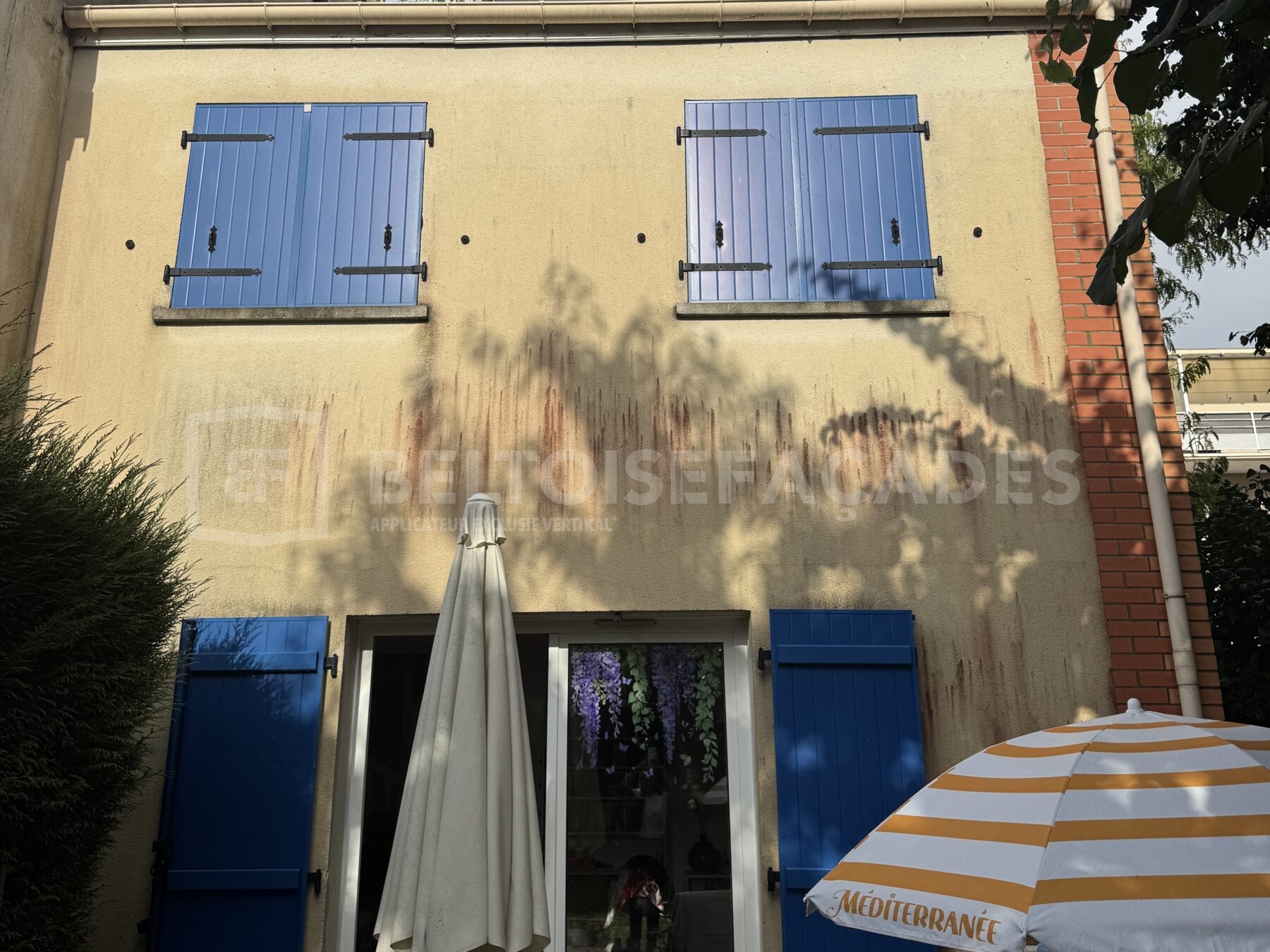 Les façades de cette maison étaient en crépis (revêtement de façade teinté dans la masse, composé d’un mélange de ciment, de sable et d’eau qui est projeté sur les murs). Ce revêtement très poreux permet à la pollution et à la poussière de s’accrocher dans les aspérités. On voit souvent des tâches noirâtres ou bien parfois des tâches rougeâtres sur ces revêtements. Ici, il s’agissait d’algues rouges. Elles proviennent souvent des particules de minerai de fer contenues dans les sables de rivière utilisés pour l’enduit.